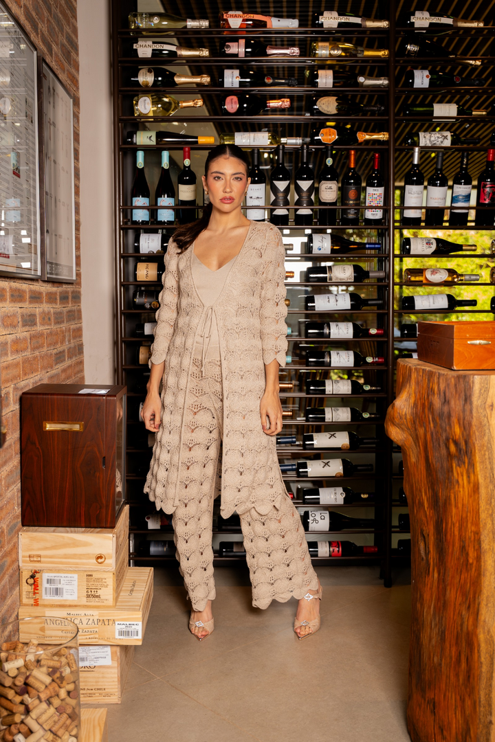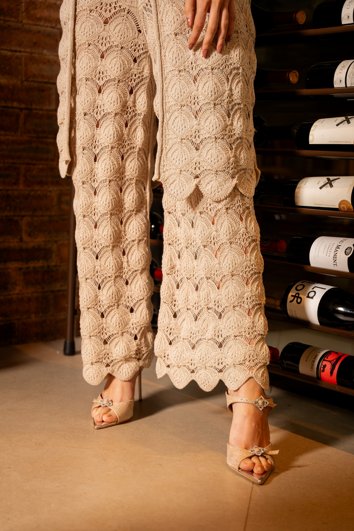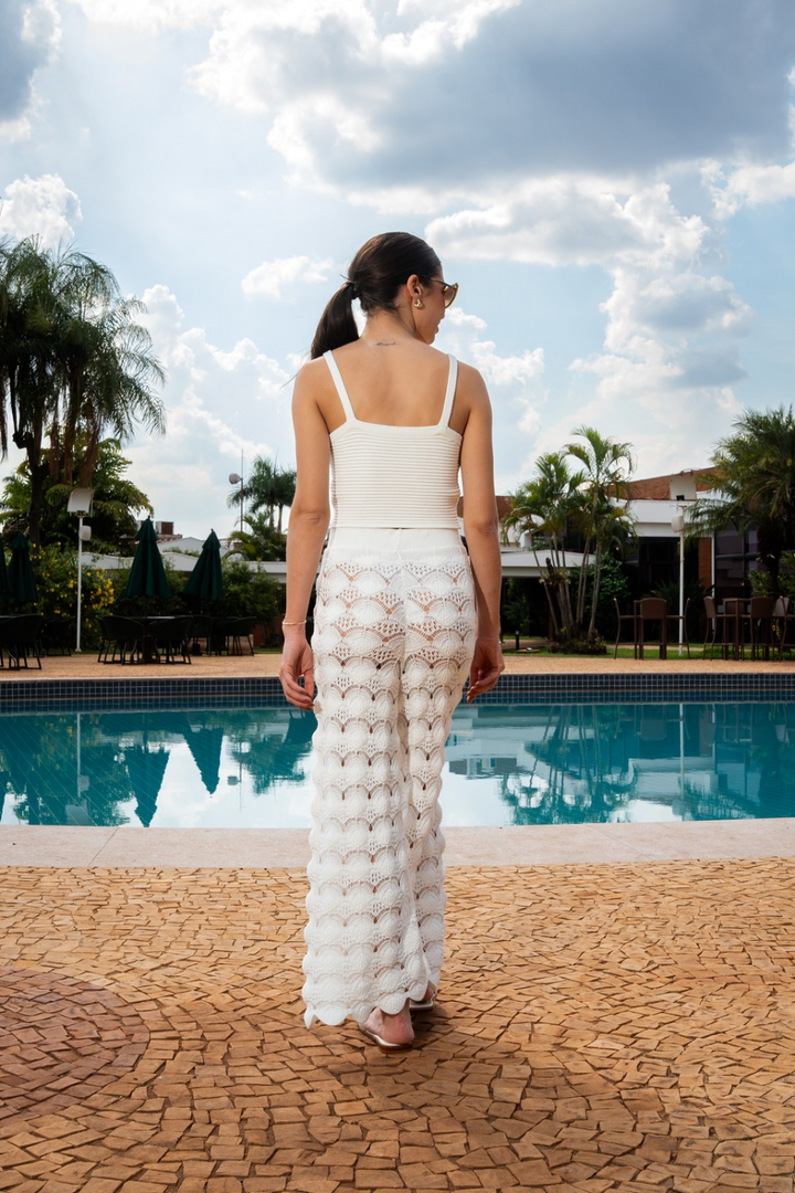 Calça rendada em tricot. Ponto único e exclusivo. Cós com elástico, tornando a mais ajustável ao corpo .Uma das peças mais chamativas da nova coleção, a Calça Camila faz parte de um coordenado com o Cardigan Helena. Há diversas sugestões de uso para a calça, pois ela acompanha um forro opcional, dando opções de utilizá - la tanto para encontros que exigem mais sofisticação, até um dia de calor na praia.