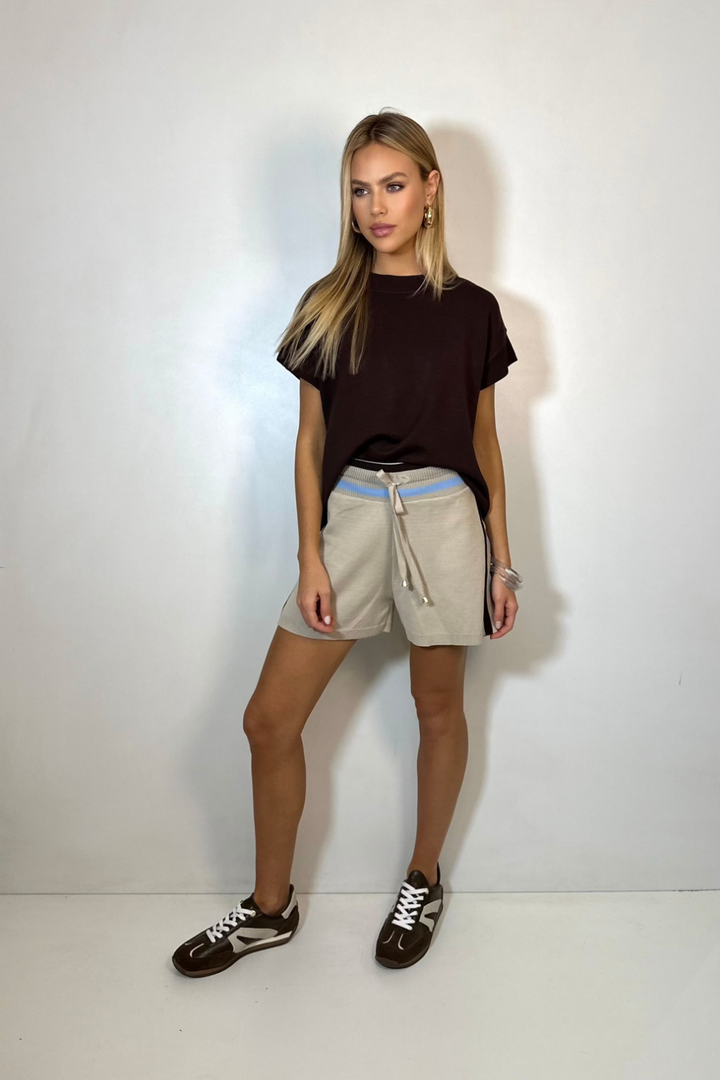 Shorts meia malha, com faixa na lateral, bicolor, cordão para regulagem e cós canelado. 70% VISCOSE|30% POLIAMIDA