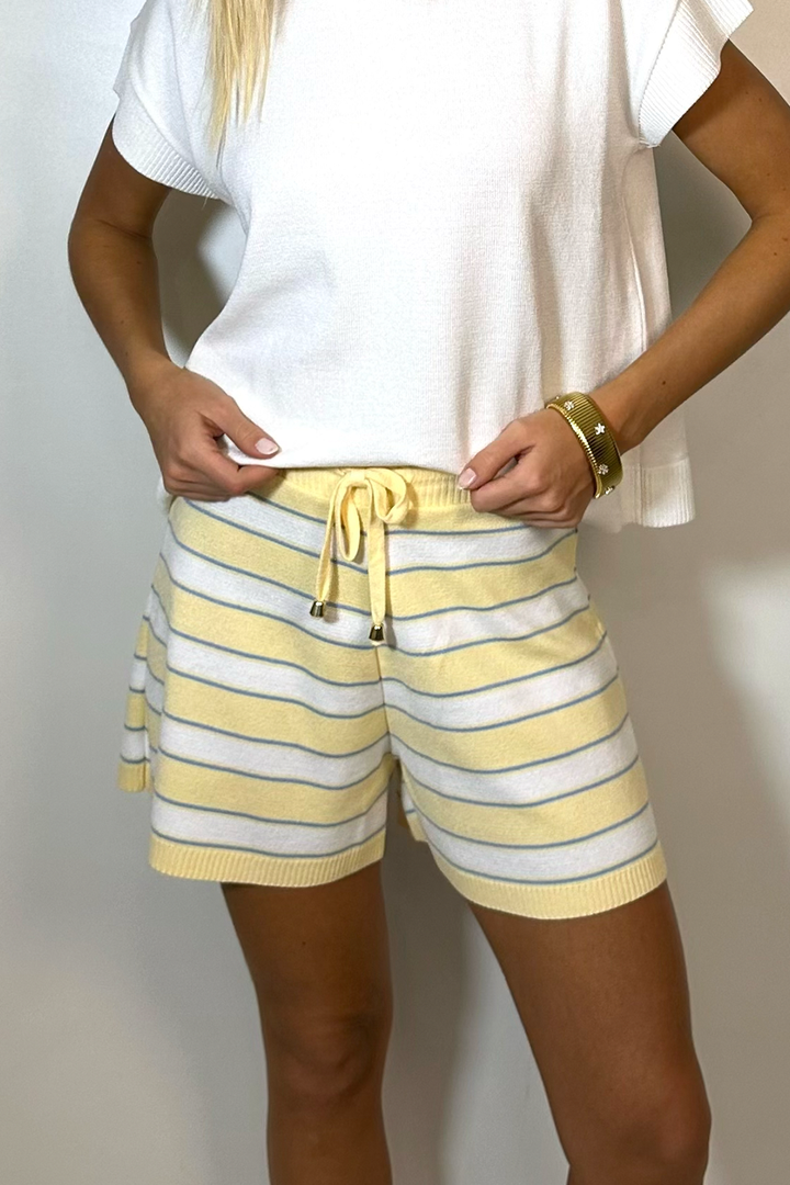 Shorts listrado em tricot, pensado em combinações para arrasar nesse verão. Possui cós canelado, com cordão funcional para regulagem na cintura. Ponto malha cheia, para evitar transparência ao vestir.