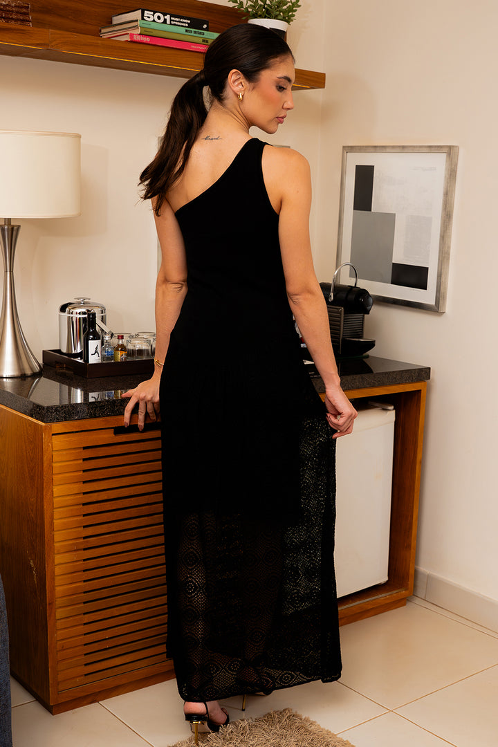 Vestido em tricot no fio Rayon. Peça com decote em um ombro só. A parte de cima (corpo) é estruturada e se ajusta ao corpo. Na parte da saia, o ponto é trabalhado na renda. Arte pura, no melhor estilo Fofolã!!