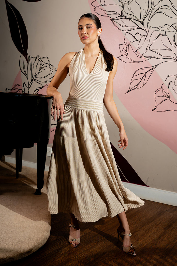 Vestido em tricot feito em viscose + lurex. Na parte do corpo o decote em formato “frente única” mais a perfeita junção da saia plissada em comprimento tipo “midi” garantem sofisticação e modernidade. Os detalhes em lurex são bem finos para garantir que o look “brilhe” sem perder a elegância.